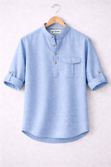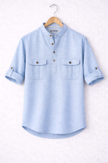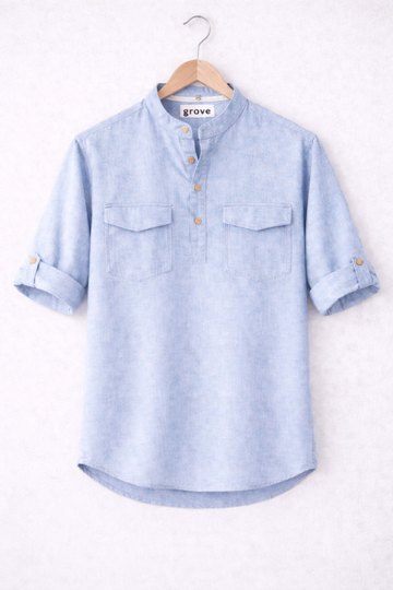 This shirt is made of cotton rich chambray fabric.